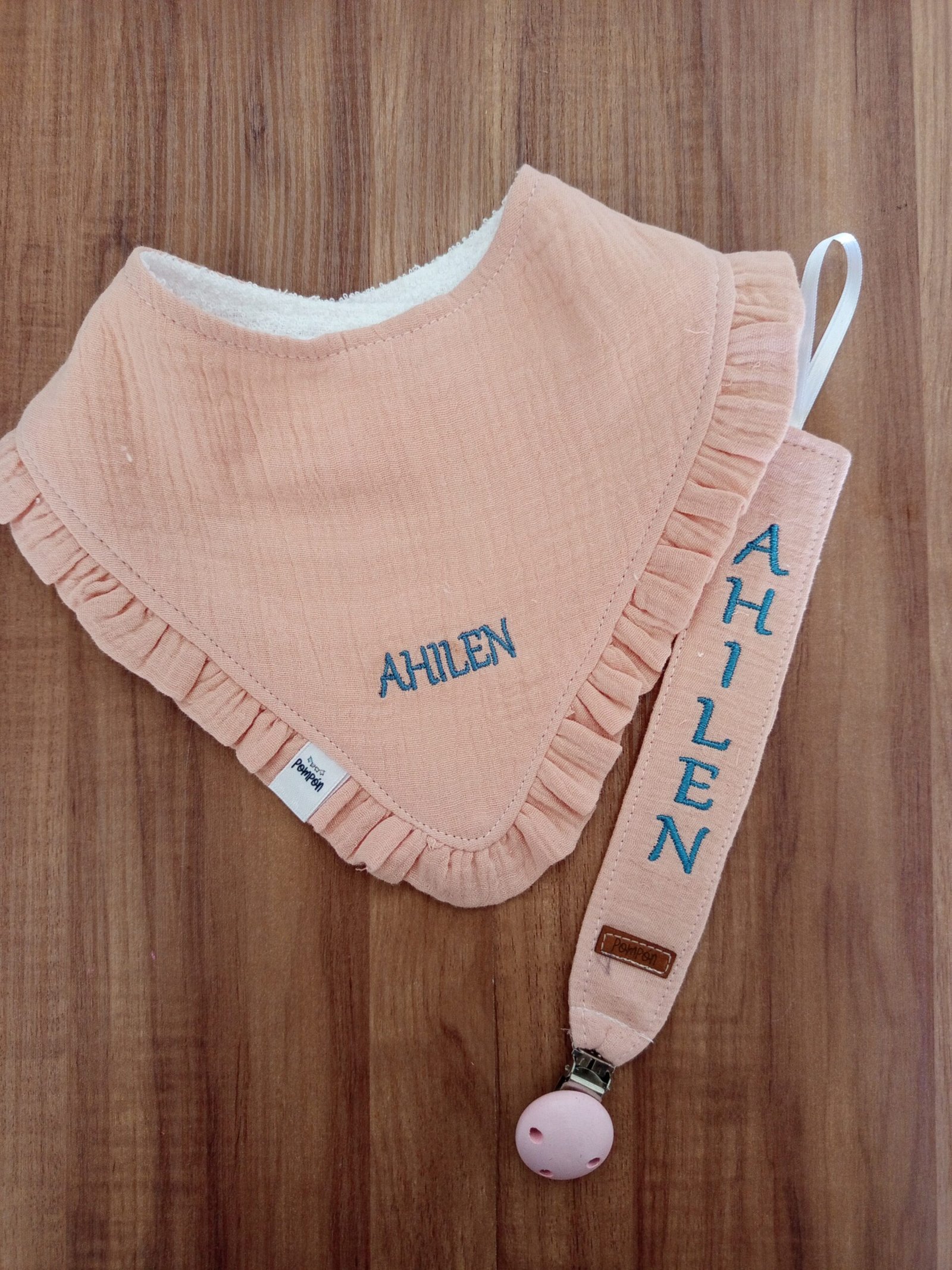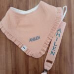 Babero realizado en tela de algodón y toalla absorbente con el nombre bordado, el babero puede tener volado o puntilla.