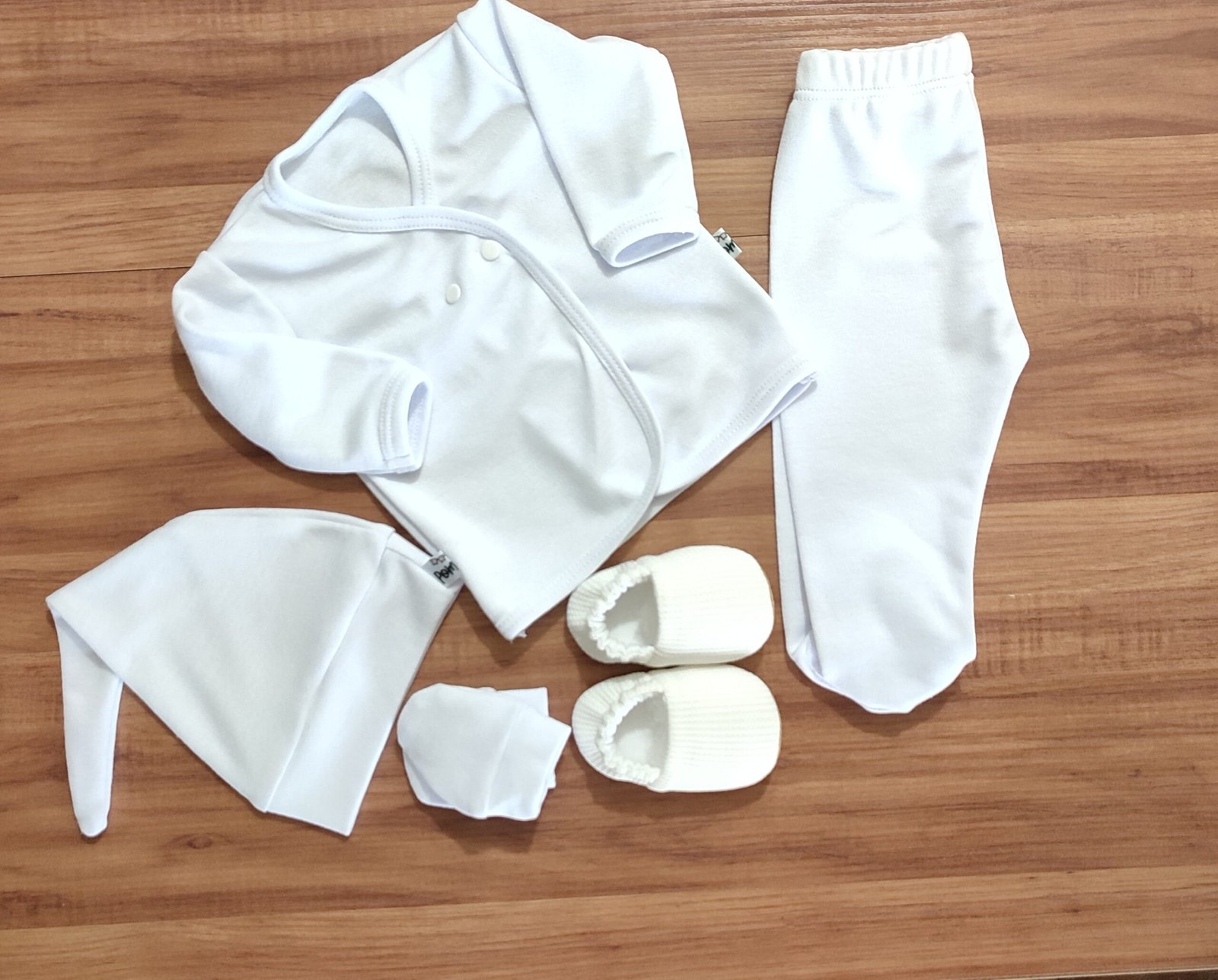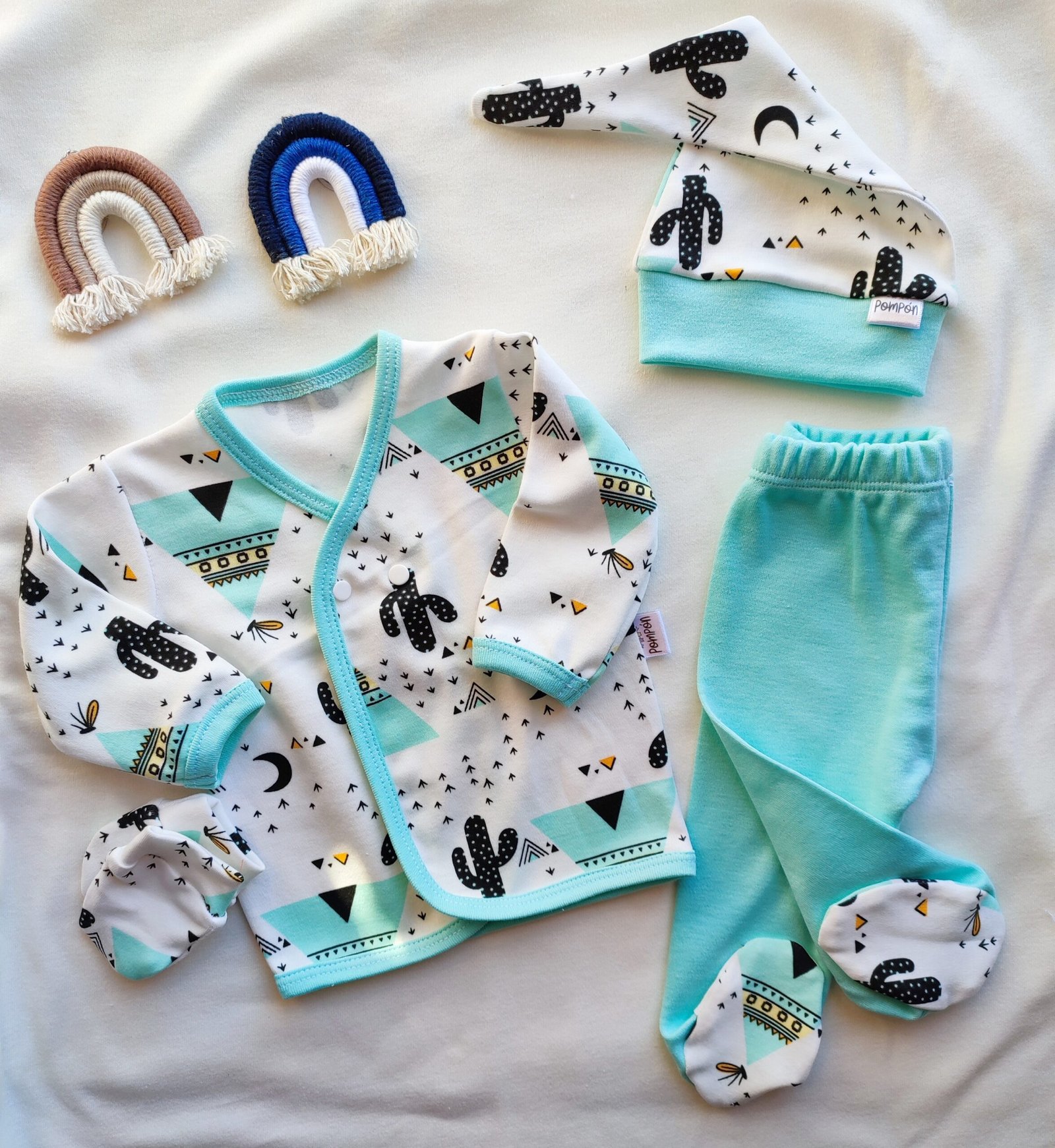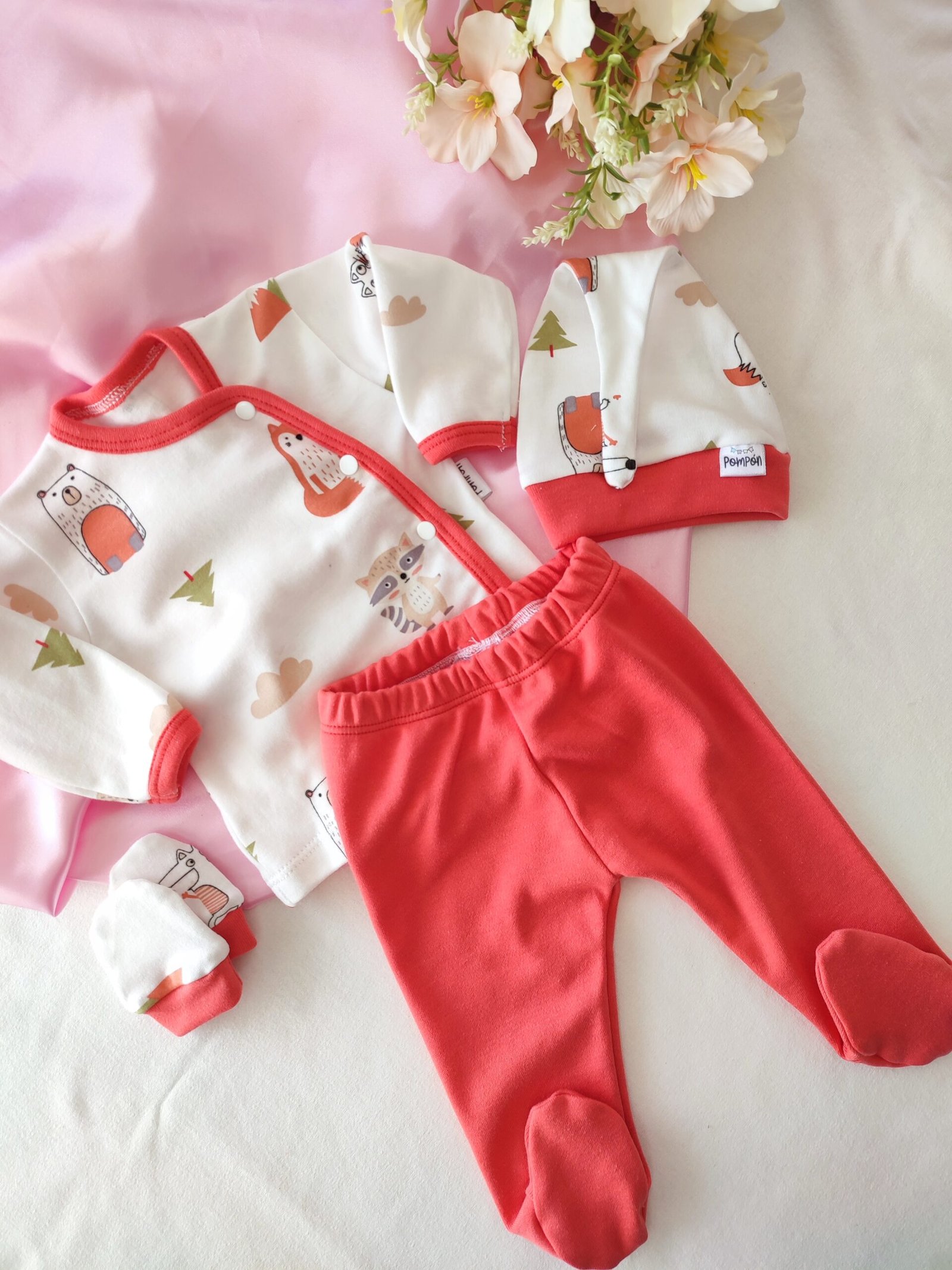 El juego se compone de: batita, pelele, gorrito y mitones.